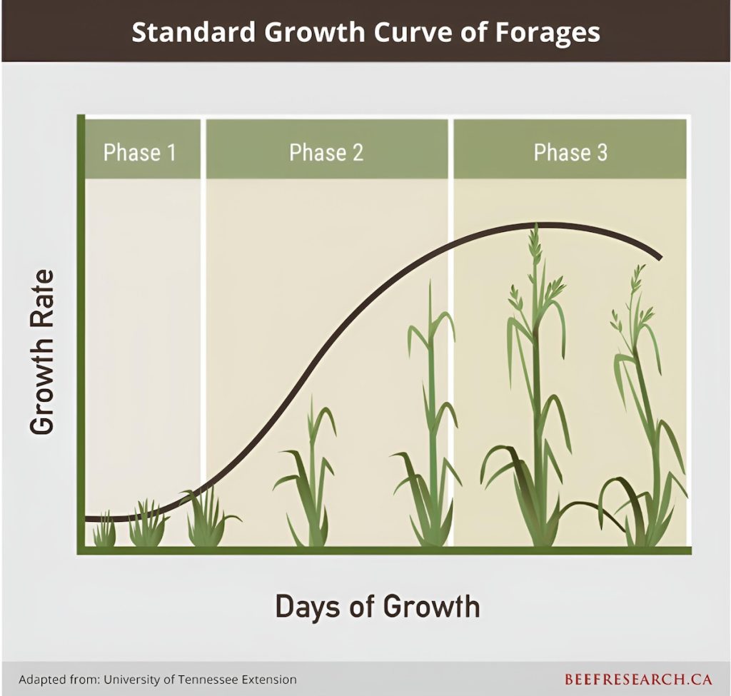 During early-season grazing, cattle remove critical leaf matter during Phase 1 of plant growth, when plants are especially vulnerable (Figure 1). At this point, the plant is relying heavily on root resources for growth and removing leaves during grazing reduces the leaf area available for photosynthesis. Managing grazing for lower plant utilization leaves more leaf area to photosynthesize and puts less stress on the plant roots. Extended rest periods provide additional time for the plants to both grow above ground and return nutrients to the roots. Without rest, desirable grazing plants lose their competitive advantage, leading to encroachment of undesirable or invader plant species.