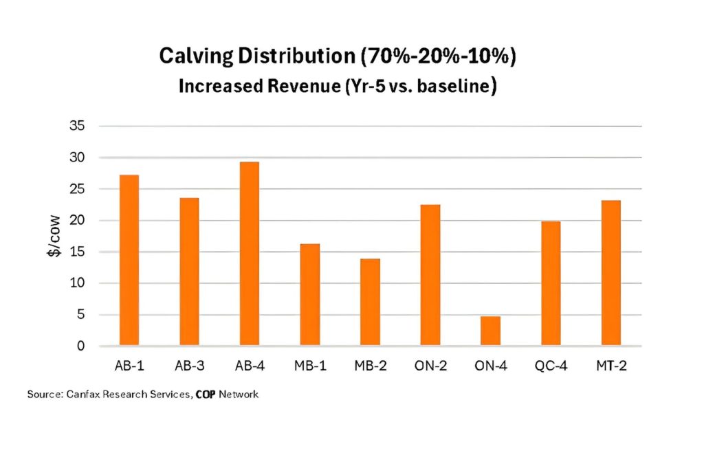 For example, farm ON-4 already had more than 85 per cent of its herd calve within the first two cycles. By shifting to the 70-20-10 target, revenue was projected to rise by only about $5 per cow. In contrast, farms with more prolonged calving seasons were able to capture much larger gains as heavier average weaning weights improved total revenue.